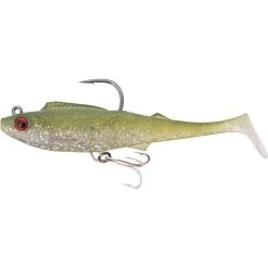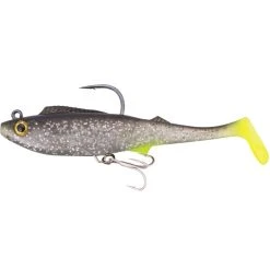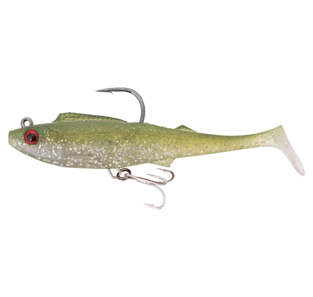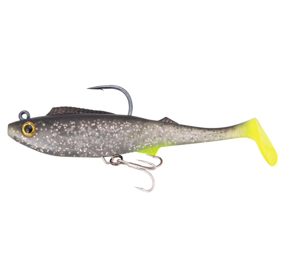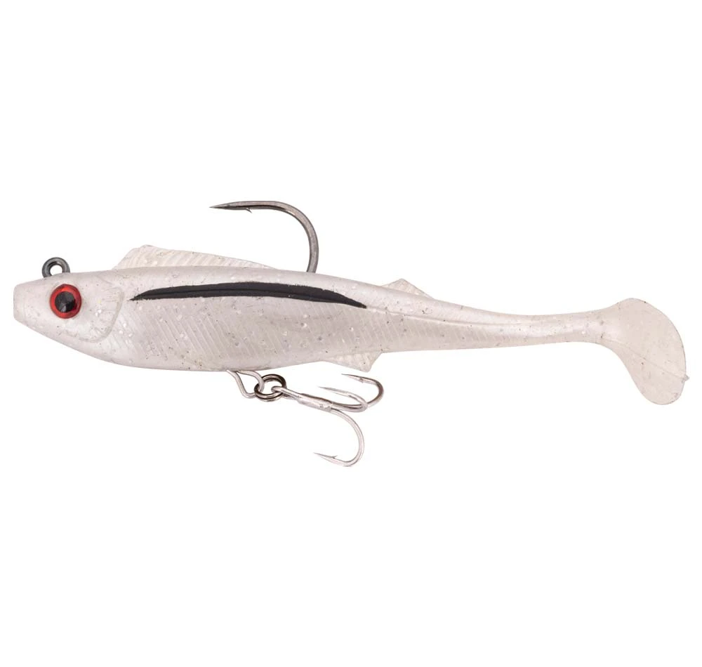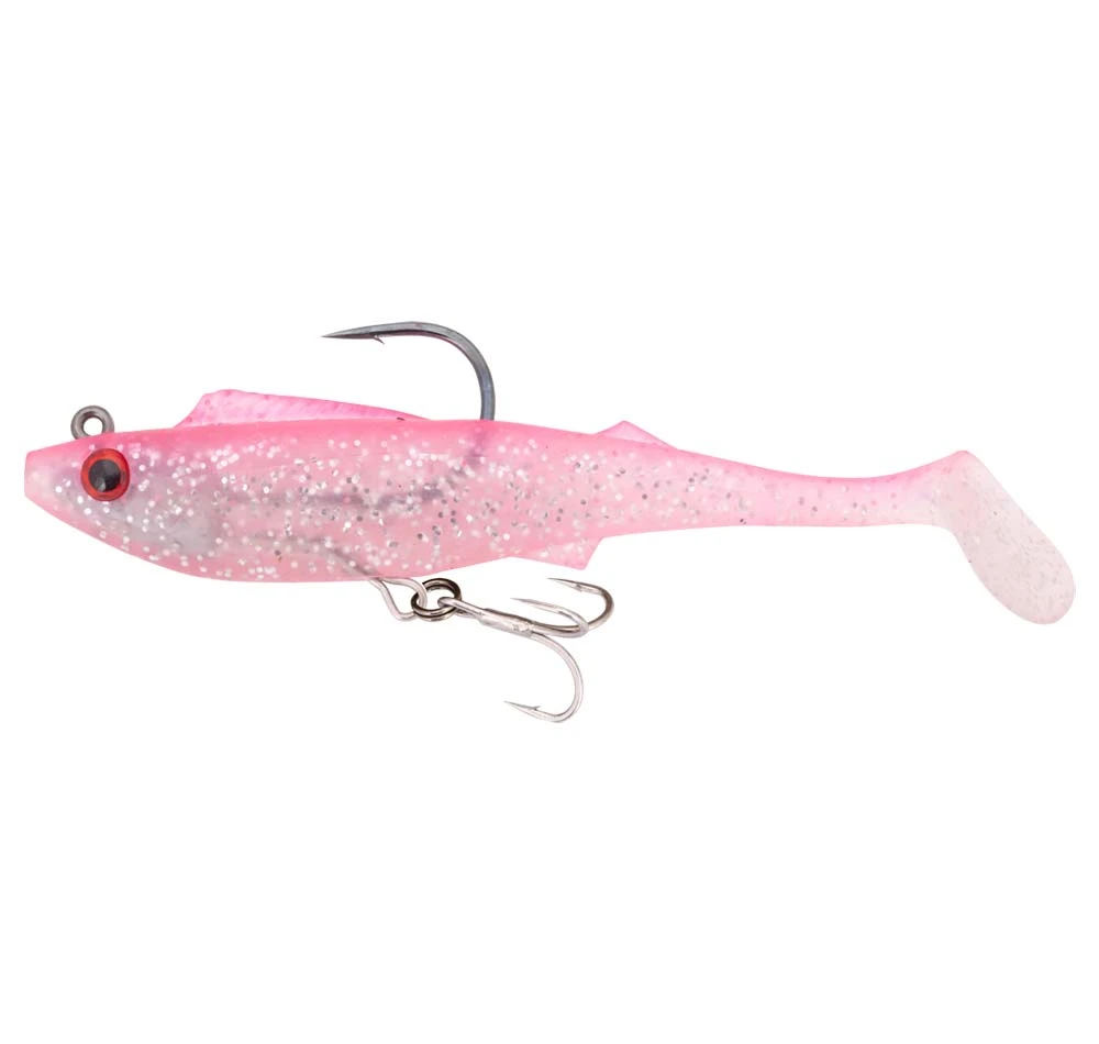 The Berkley Shimma Pro-Rig is built for big fish that pull hard. Fitted with a removable weighted hook and a single Owner STX Taff Wire Treble and a Hyperwire split ring, this bait is an out-of-the-packet solution for prized fish like Mulloway, Barramundi and Murray cod. With a thick body profile and a tapered off paddle tail, the Shimma Pro-Rig has a strong body roll and a wide tail action, perfect for slow rolling across weed beds, rock bars, and drop offs for those ambush predators. Built from durable Thermal Plastic Elastomer (TPE), the body is super tough and withstands plenty of punishment from predators with serious jaw strength, and raspy or toothy mouths! The Berkley Shimma Pro-Rig is available in a variety of colours and sizes to suit a wide range of species in both fresh and saltwater environments. Every angler hunting serious fish needs a Berkley Shimma Pro-Rig in the tackle box. So come on down and grab yourself one today!