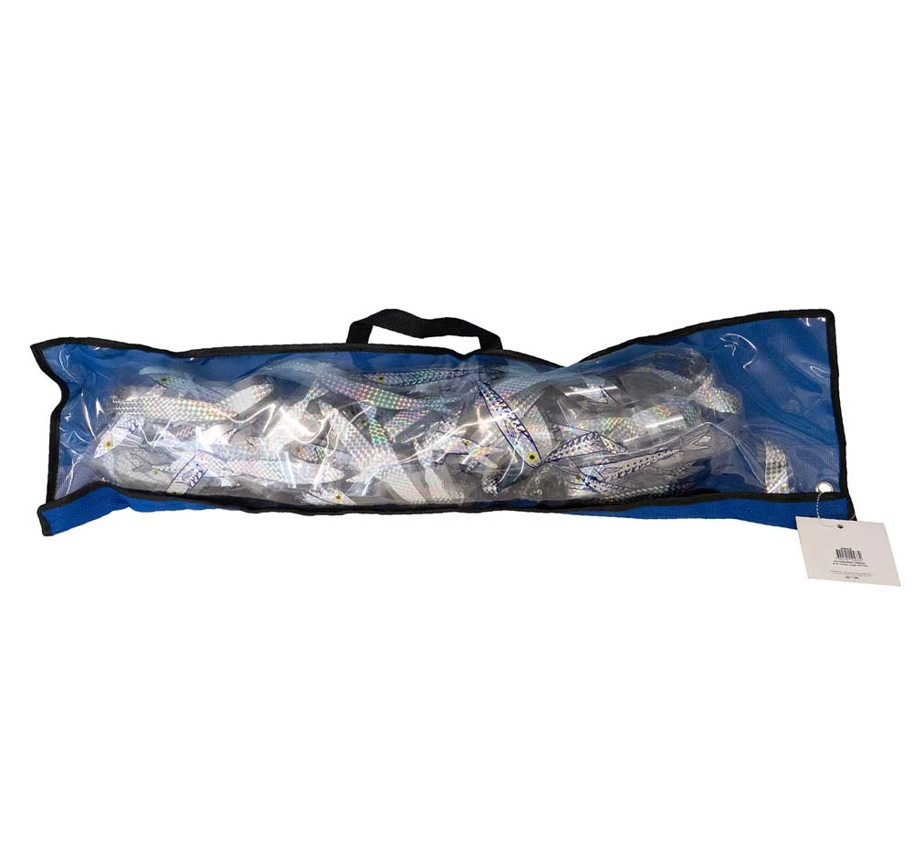 The Buku Dredge Strip Teaser is a pre-made dredge teaser that consists of 13 cups coming off the dredge, each cup has 3 individual strips on it that have 3 holographic fish on the outside strips, 4 fish on the inner strips, and 5 on the middle strips. All fish are laminated into the strips so they don’t peel off. In total that’s 141 holographic fish, which really makes this teaser look like a seriously big school chasing the boat!