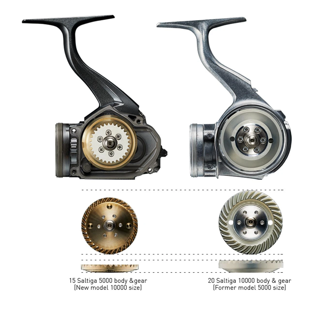 - G1 Duralumin Drive Gear – The larger diameter drive gear. Increasing the diameter by 12% and also increasing thickness reduces the amount of wear, including twist and deformation to both the drive & pinion gears. In comparison to 15 Saltiga, it is more than double the strength. New gear design combined with MQ body makes 20 Saltiga the pinnacle of saltwater spinning reels.