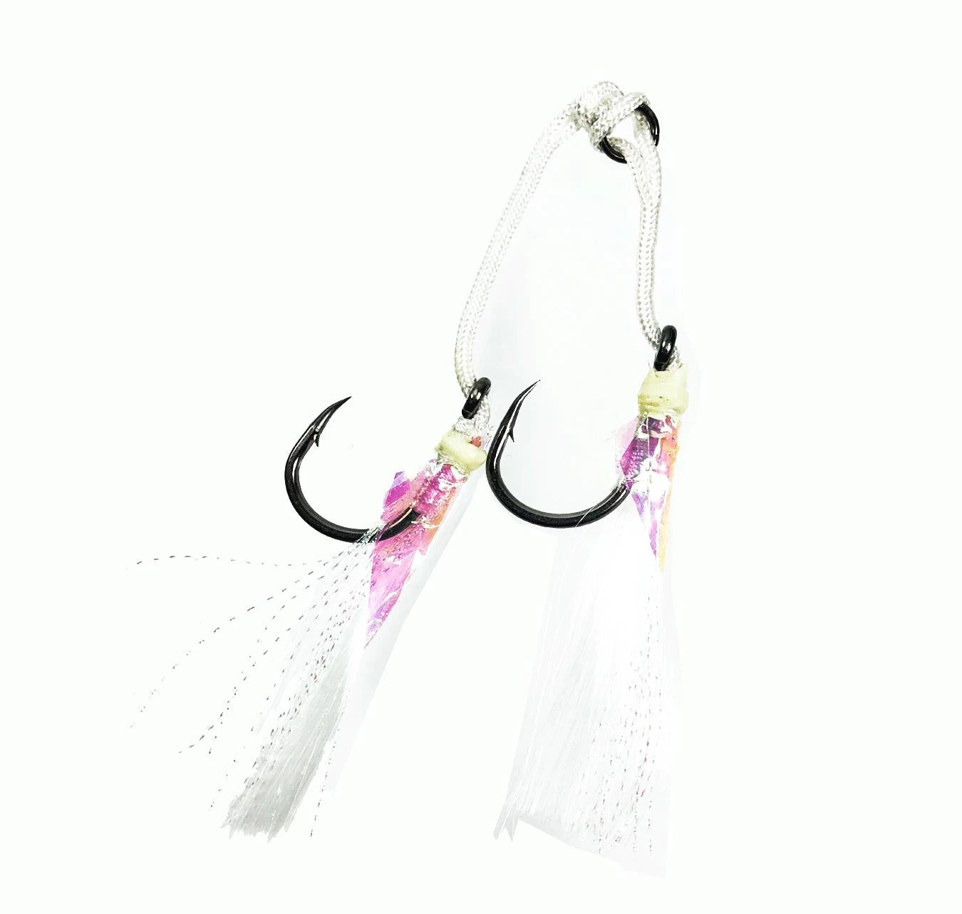 The Dog Tooth Dual Assist Hooks Offset are a a heavy duty assist hook consisting of a solid ring, a 65mm chord attached to a hook and a 40mm chord attached to a hook, each hook also contains holographic tape and feathers for extra attraction.