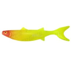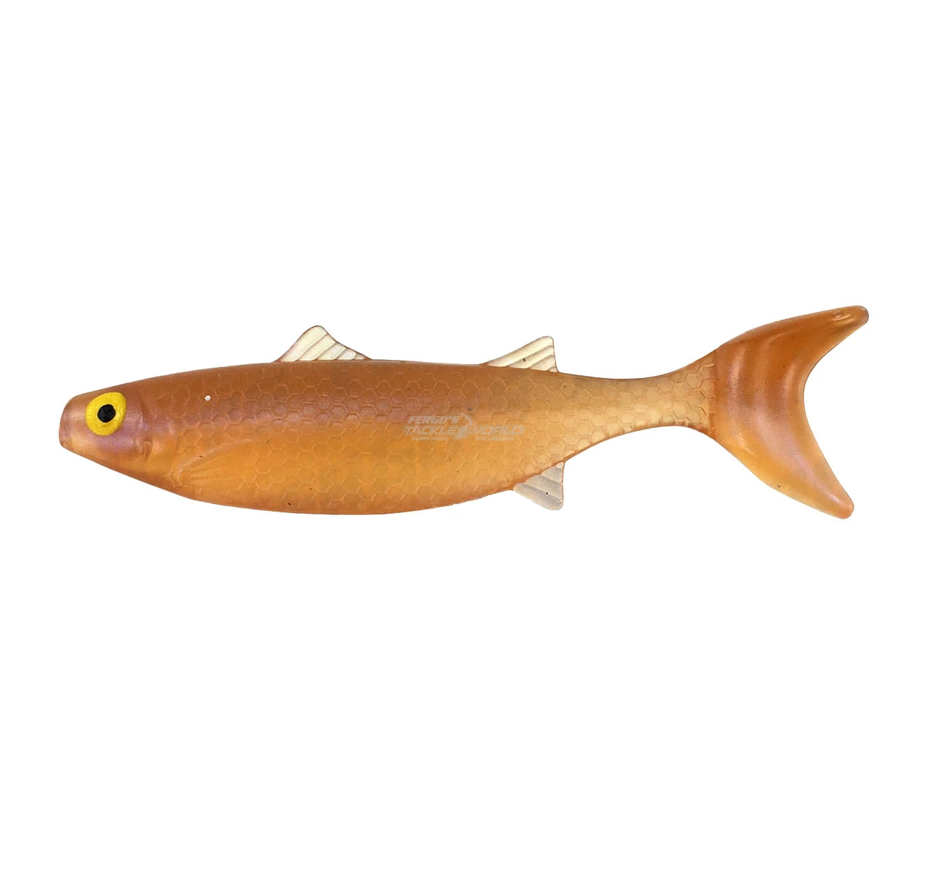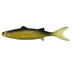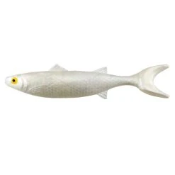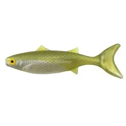 Its body shape is a deadset mullet and its internal body cavity allows for a jighead and a weedless rig.