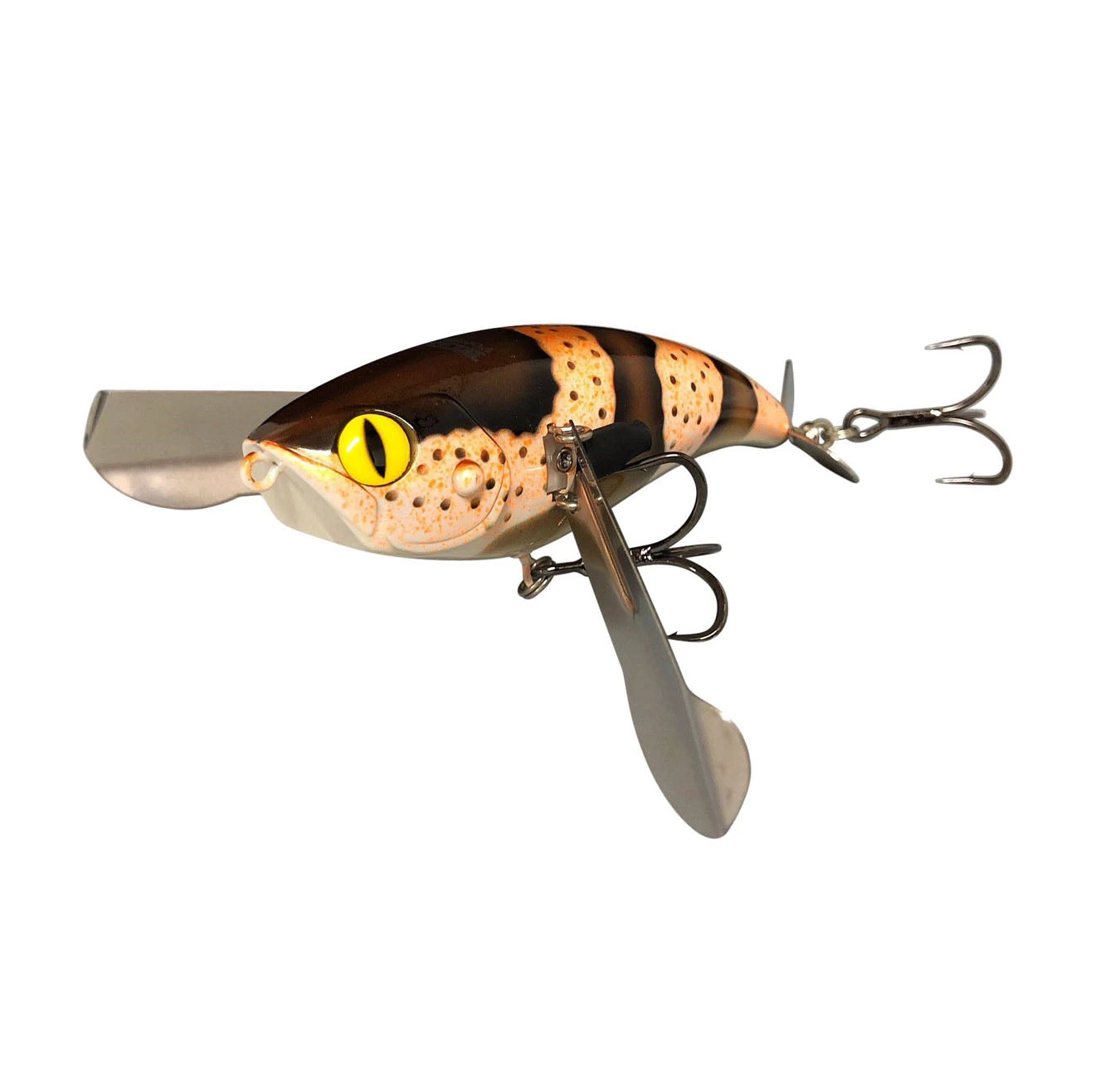 The Jackall Mega Pompadour is the big crawler bait for universal game fish such as Black Bass, Peacock Bass, Pike, Murray Cod and Cat Fish. The Mega Pompadour is a super high appeal crawler bait that has a strong crawl action made by metal wings, noisy sound, two types of rattles and water splash made by the rear prop. Expect high performance from Mega Pompadour.