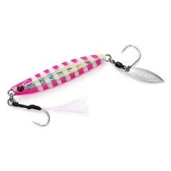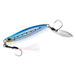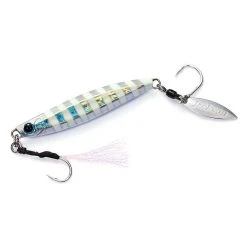 The Jackson Metal Effect Blade 30g Lure is a variation on the largely popular Jackson Metal effect Stay Fall Lure. It is a unique slimline micro jig/casting metal hybrid with a great action both on the retrieve and on the drop. It was designed to be as versatile as possible and to be used with a jerking retrieve (either vertical jigging or casting with a jerking retrieve), and as such can be used from the shore where long casts are needed or out of the boat dropping over the side. The most obvious and notable change from the design of the original Jackson Metal Effect Slow Fall to the Jackson Metal Effect Blade Lure is the addition of the blade and single hook at the rear of the lure. We here at Fergo’s have personally tested these bad boys out and can tell you with confidence that the action, flash and spin that the Jackson Metal Effect Blade lure generates is unreal! With a super tight and bright blade spiral, the Jackson Metal Effect Blade is sure to generate some attention whether you’re jigging or spinning.