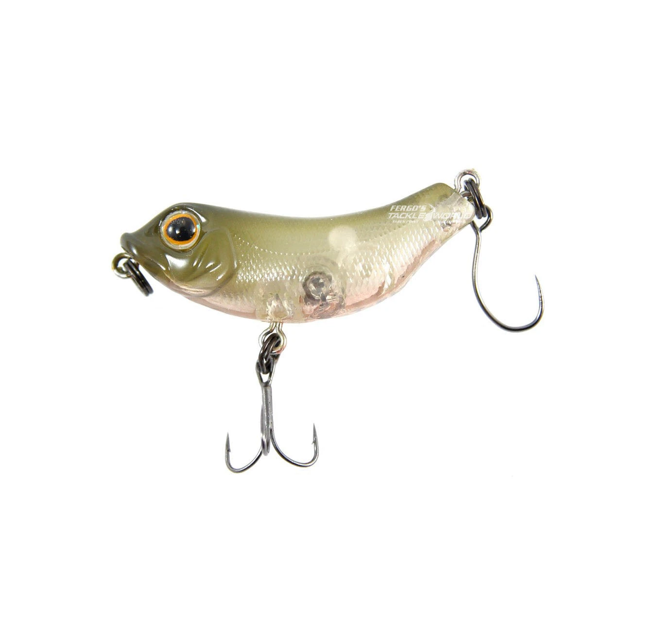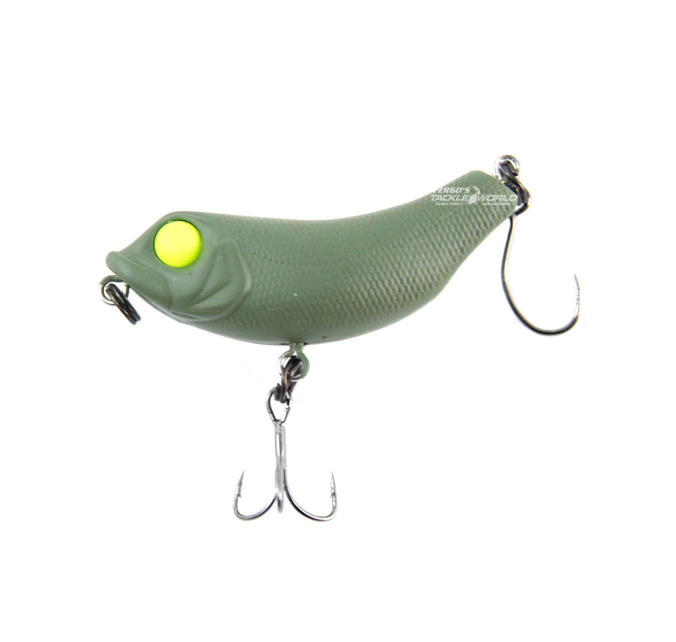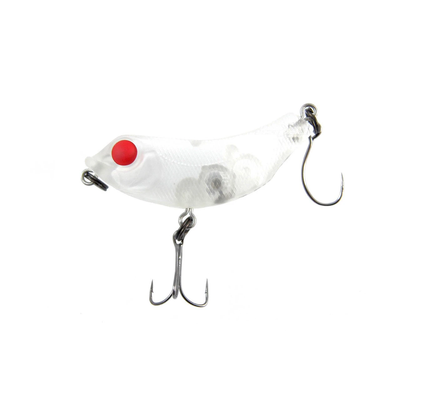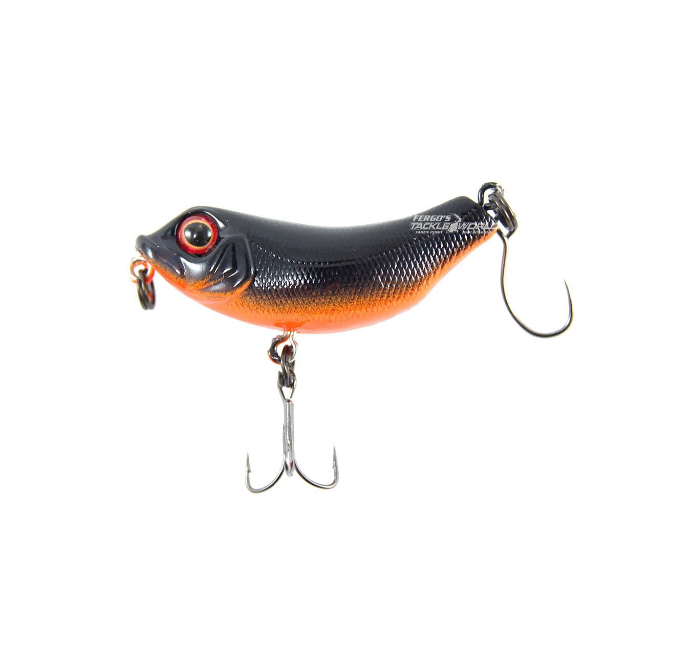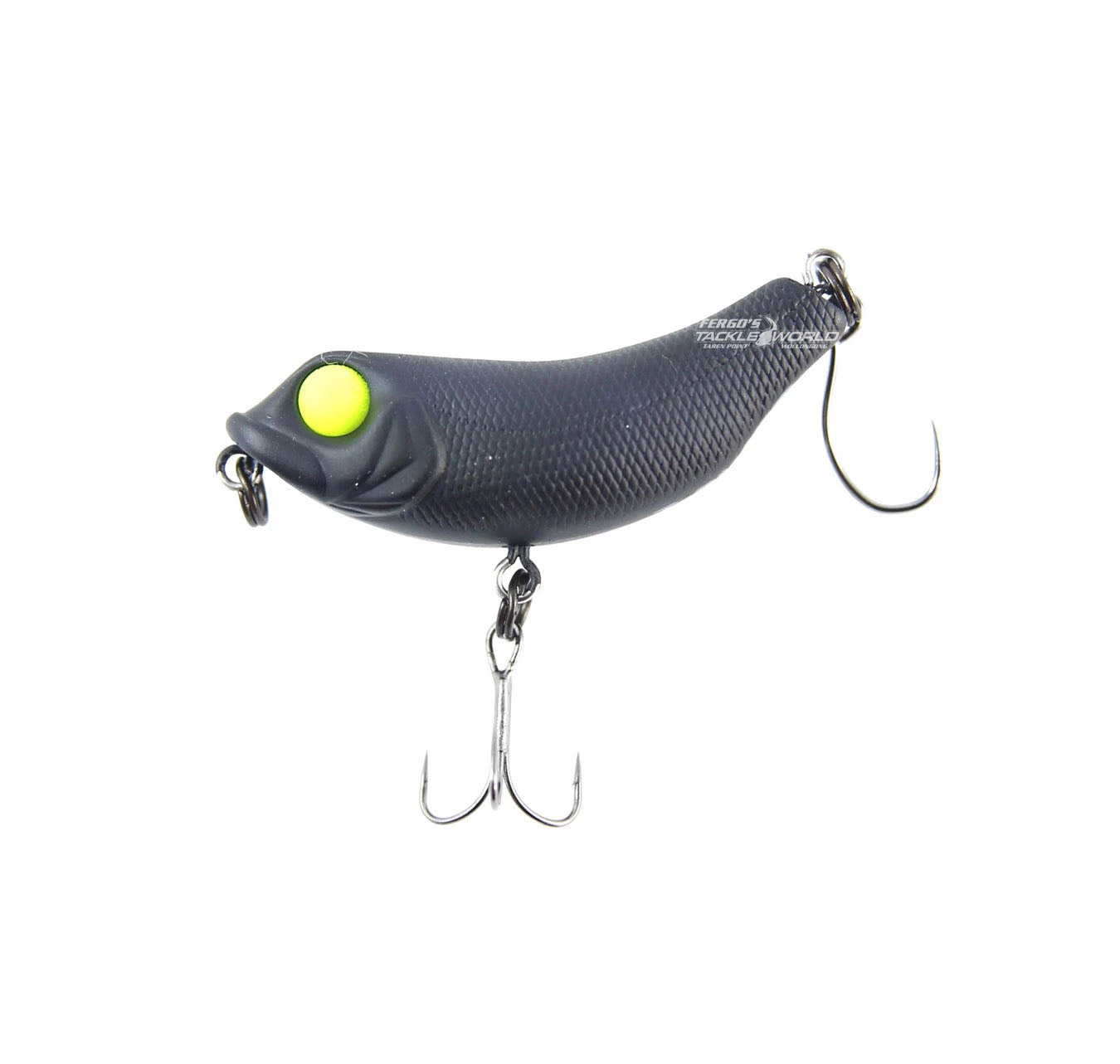 Its warped body shape has its’ centre of gravity midsection, giving it a “table turn” action. It has a tungsten weight ball inside that helps increase casting distance and also will emit a clicking sound to attract predators. This lure has a unique walk the dog, slide and pop action which makes it irresistible to Bass. It has a single rear hook (ST-11 #14) for easier release and a mid-treble (S-55BLM #10).
