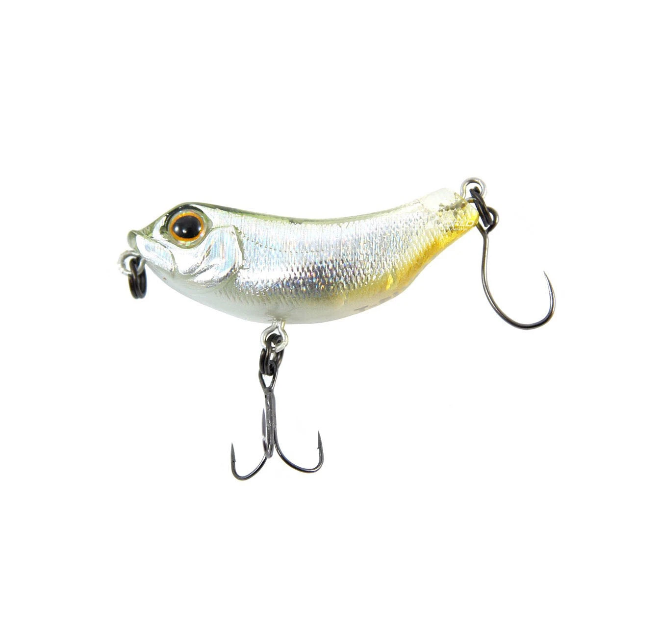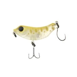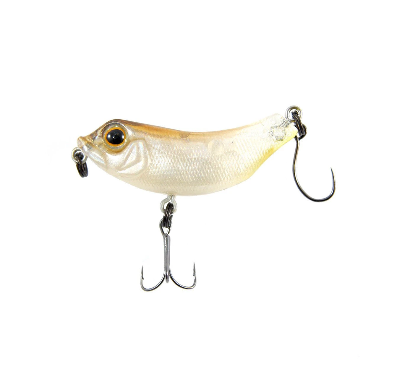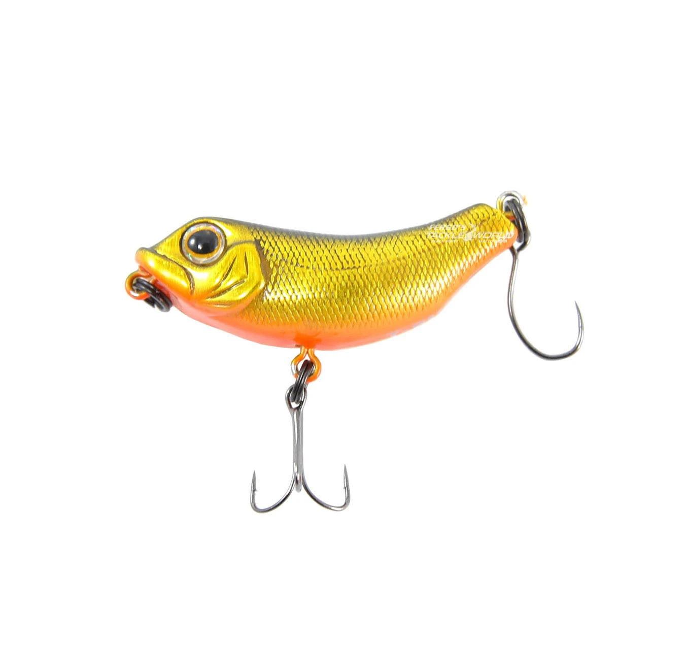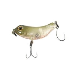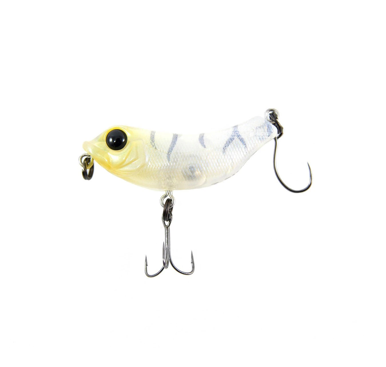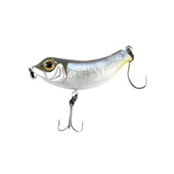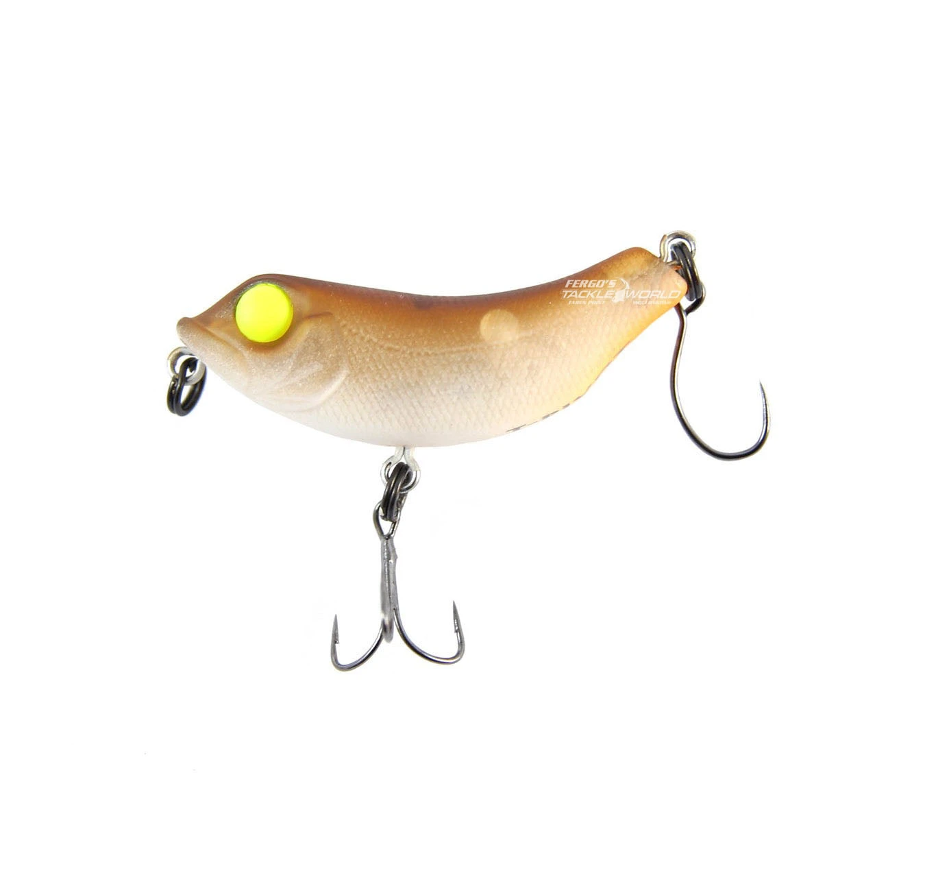 Its warped body shape has its’ centre of gravity midsection, giving it a “table turn” action. It has a tungsten weight ball inside that helps increase casting distance and also will emit a clicking sound to attract predators. This lure has a unique walk the dog, slide and pop action which makes it irresistible to Bass. It has a single rear hook (ST-11 #14) for easier release and a mid-treble (S-55BLM #10).