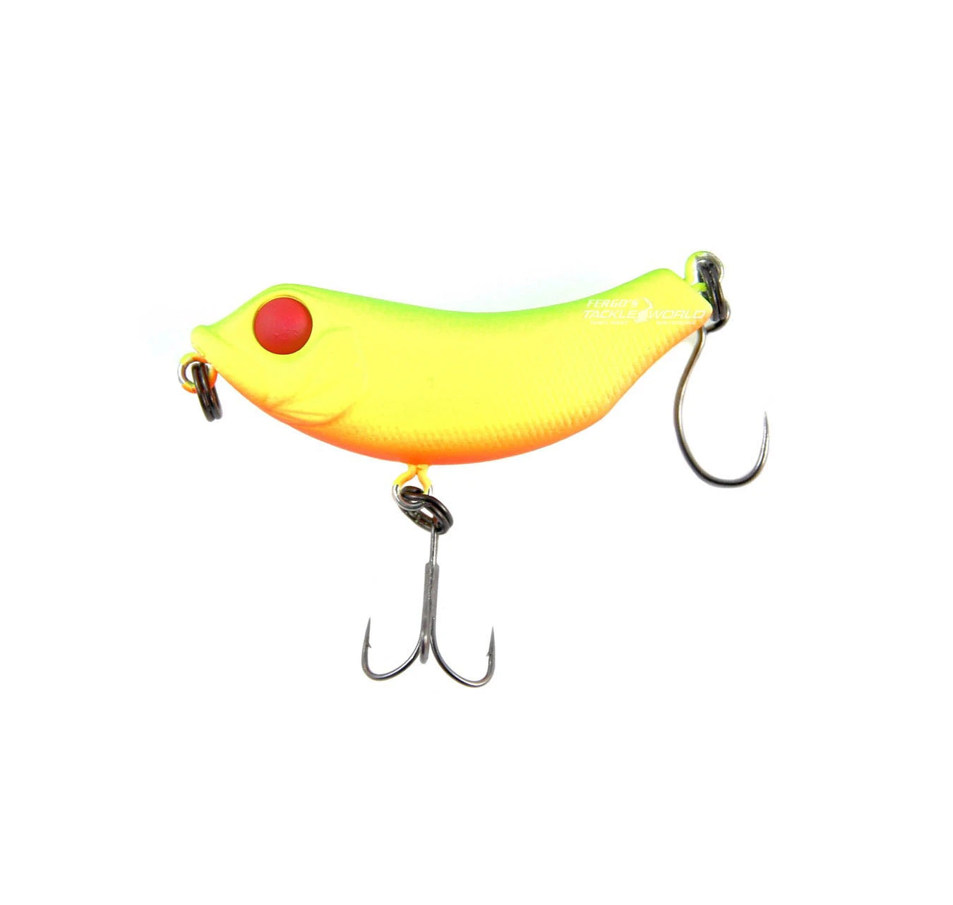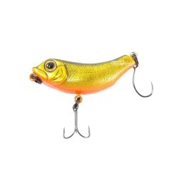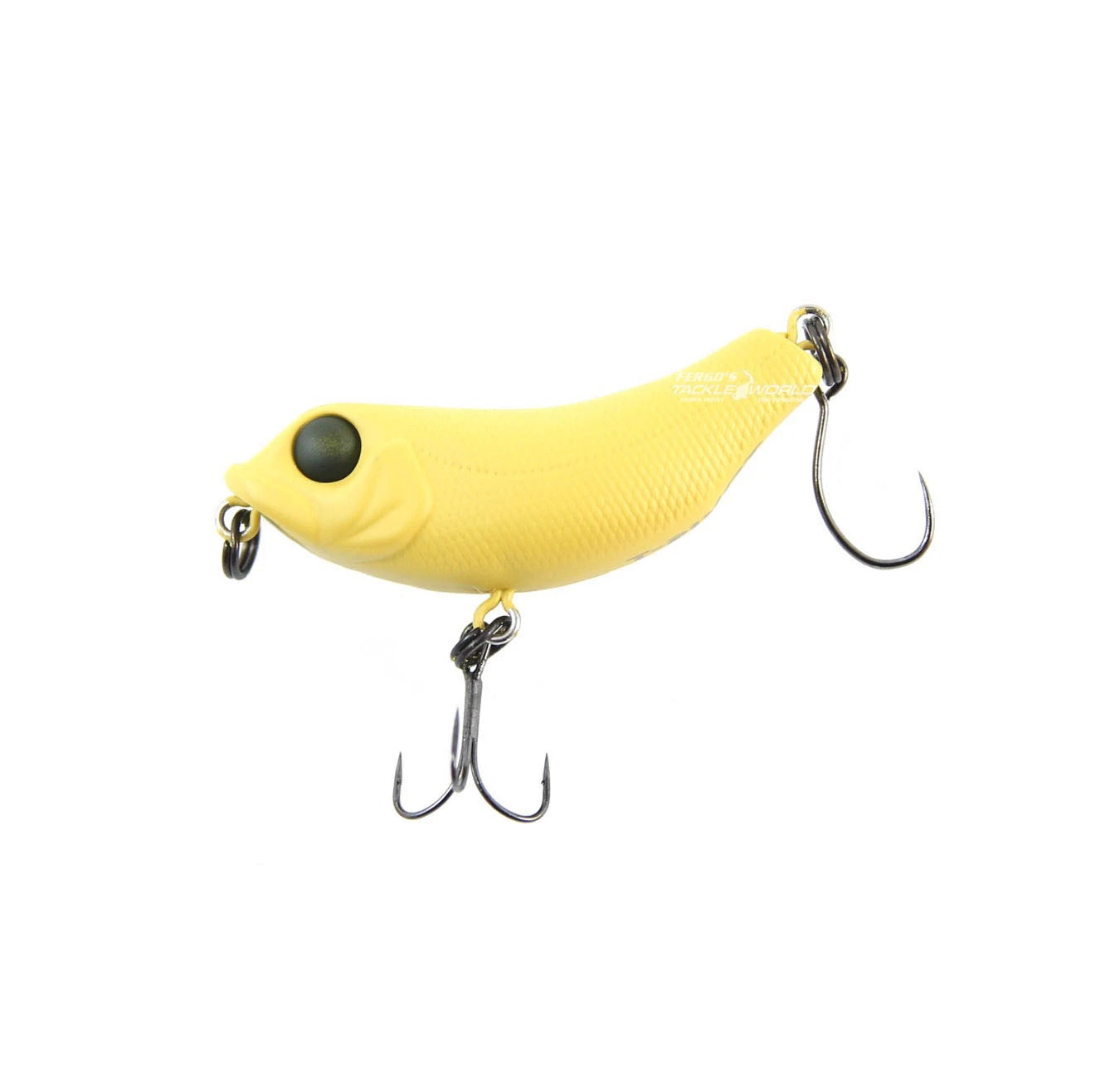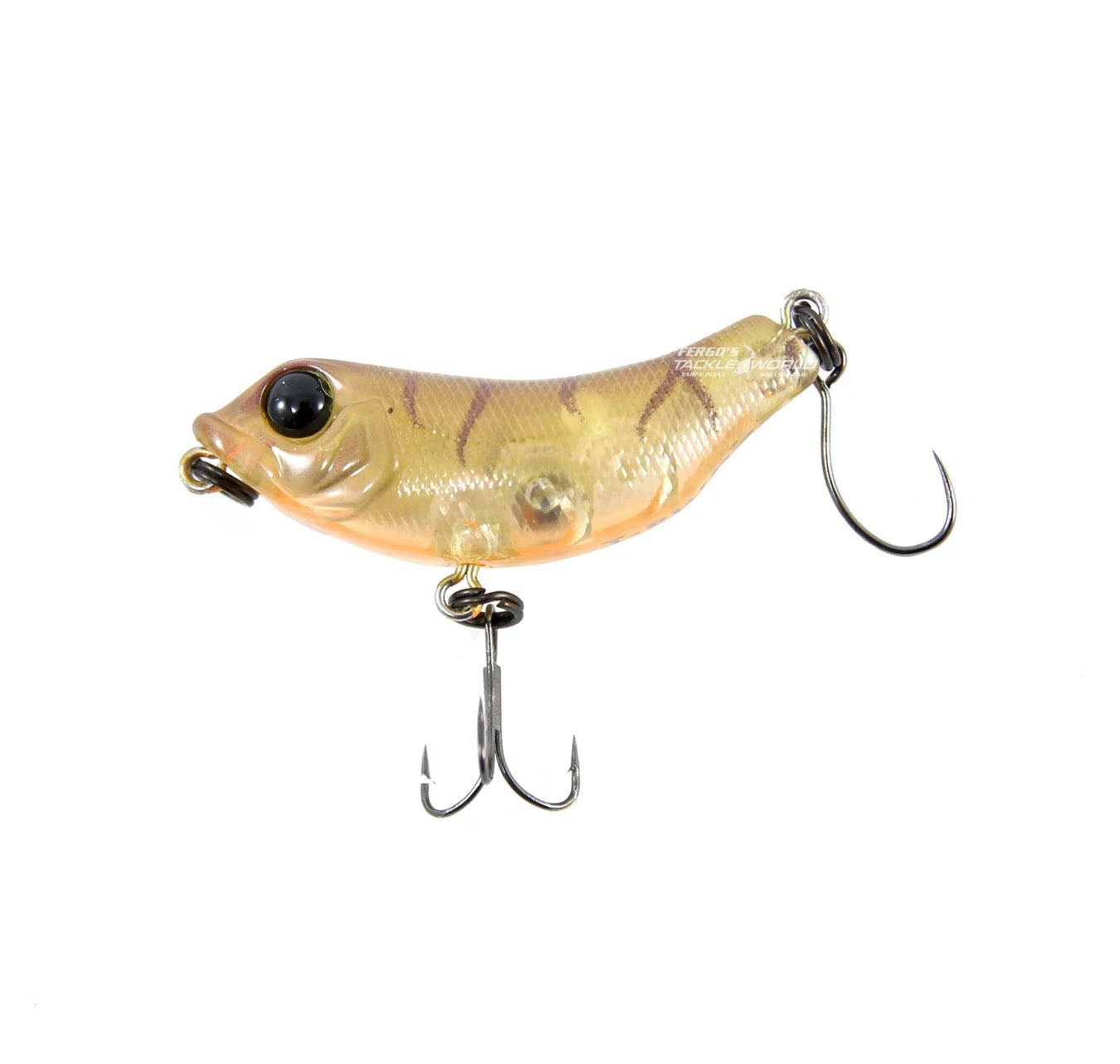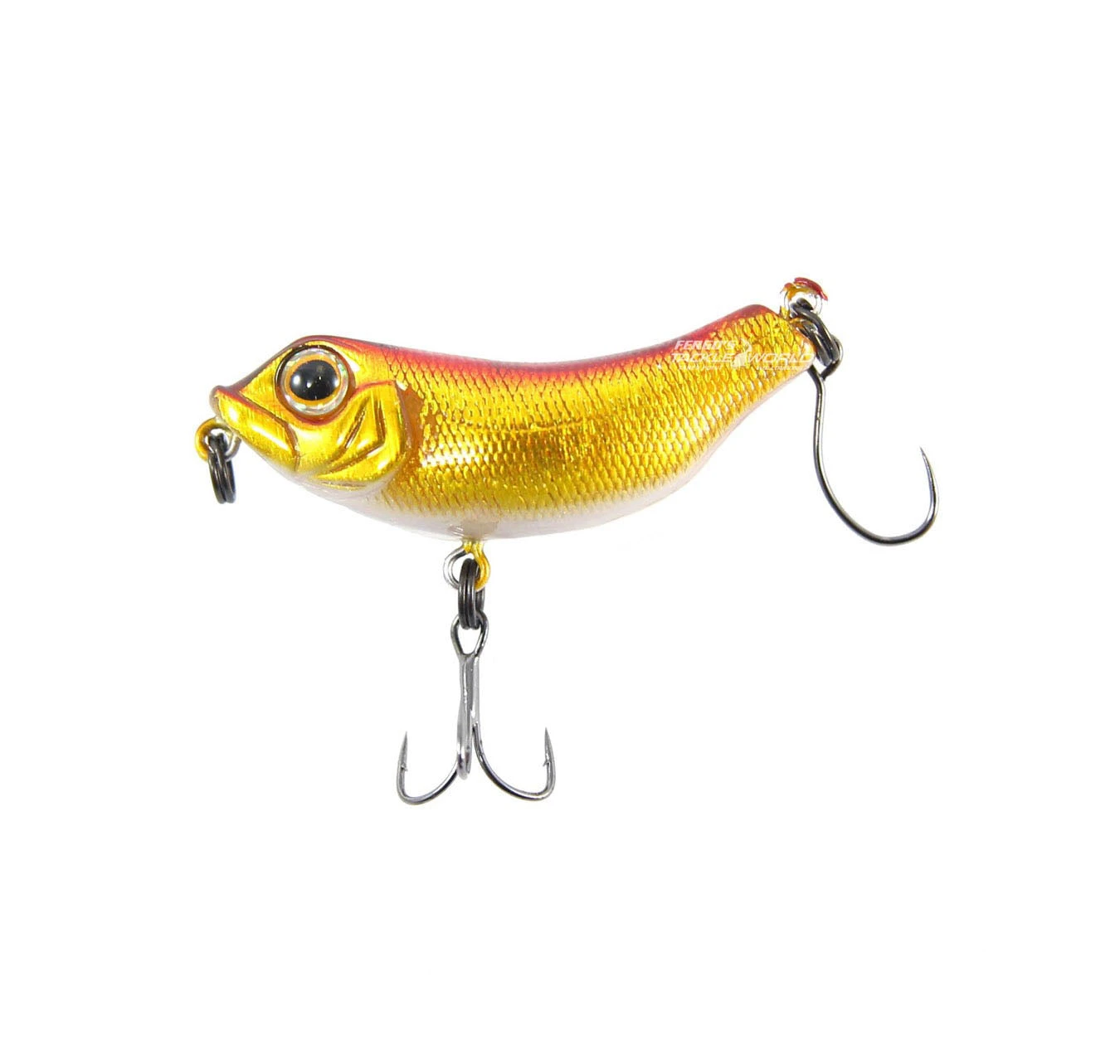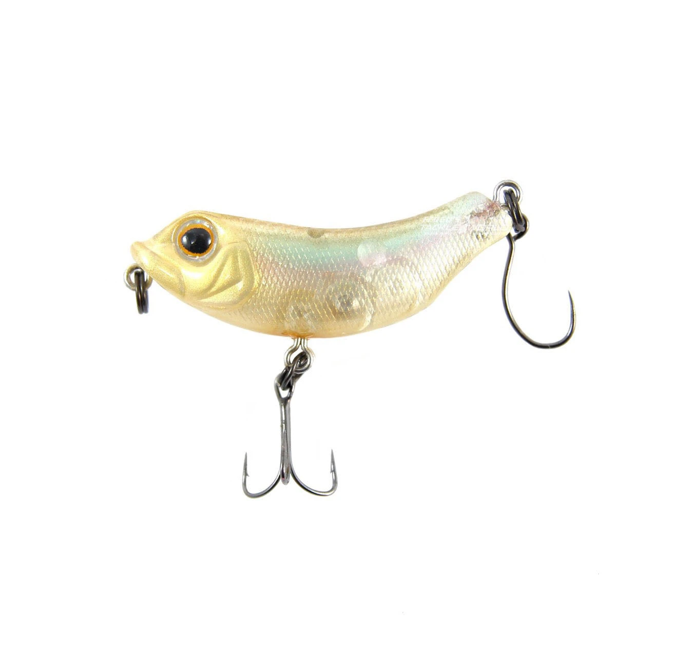Its warped body shape has its’ centre of gravity midsection, giving it a “table turn” action. It has a tungsten weight ball inside that helps increase casting distance and also will emit a clicking sound to attract predators. This lure has a unique walk the dog, slide and pop action which makes it irresistible to Bass. It has a single rear hook (ST-11 #14) for easier release and a mid-treble (S-55BLM #10).