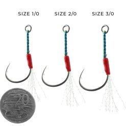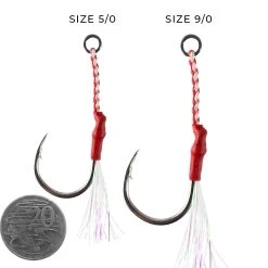 The 5/0 and 9/0 sized hooks come in packs of 2 assist hooks and are much heavier gauge hooks suited for bigger and harder fighting species like big tuna.
