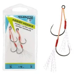 The Shinto Pro Ultra Light Assist Hooks are the perfect addition to your light offshore and beach/rock casting lures and jigs. Their thin and super sharp barbs penetrate easily, and the flexible assist chord means they’re a whole lot harder for the fish to lever out of their mouths once hooked. If you’re having trouble with trebles getting caught on the bottom with your jigs, assist hooks off the higher tow points also won’t catch anywhere near as much, saving you big time around reefy bottoms.