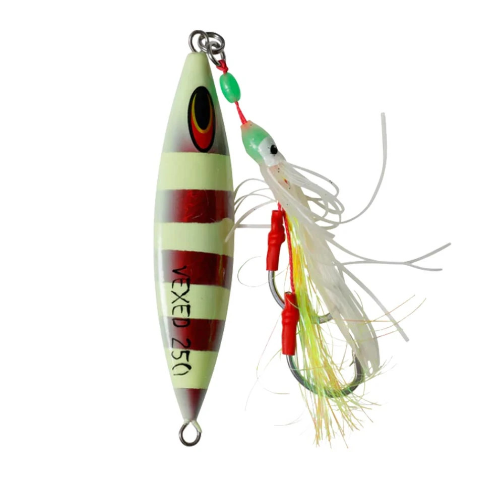 The Vexed Dhu Drop has been specifically designed to be fished slow and deep with the assistance of a rubber occy assist hook. This greatly improves visibility and achieves more solid internal jaw hook ups, as most fish will bite the occy head assist, which is rigged with 2 super sharp hooks. These slow pitch jigs have been designed to fish for demersal species such as red emperor, coral trout, grouper, cod and snapper and all of the colour options are laced with glow and UV.